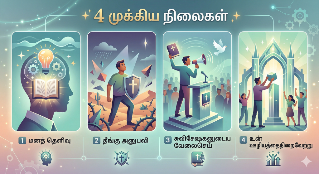 நாம் இந்த உலக வாழ்க்கையை வெற்றிகரமாக முடிக்க விரும்பினால், வேதாகமம் நமக்கு 4 முக்கியமான நிலைகளை கற்றுக்கொடுக்கிறது. இந்த நிலைகள் நம்மை ஆன்மீகமாக வளர்த்து, உலக வாழ்க்கையை தேவனுடைய சித்தத்தின்படி வெற்றிகரமாக நிறைவேற்ற உதவுகின்றன.